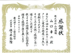令和7年11月2日(日)に第3回クレーンオペレーター競技会が開催されました。 その際にクレーン免許取得40年の熟練オペレーターへ感謝状が授与されました。 おめでとうございます!今後益々の活躍を期待しています!